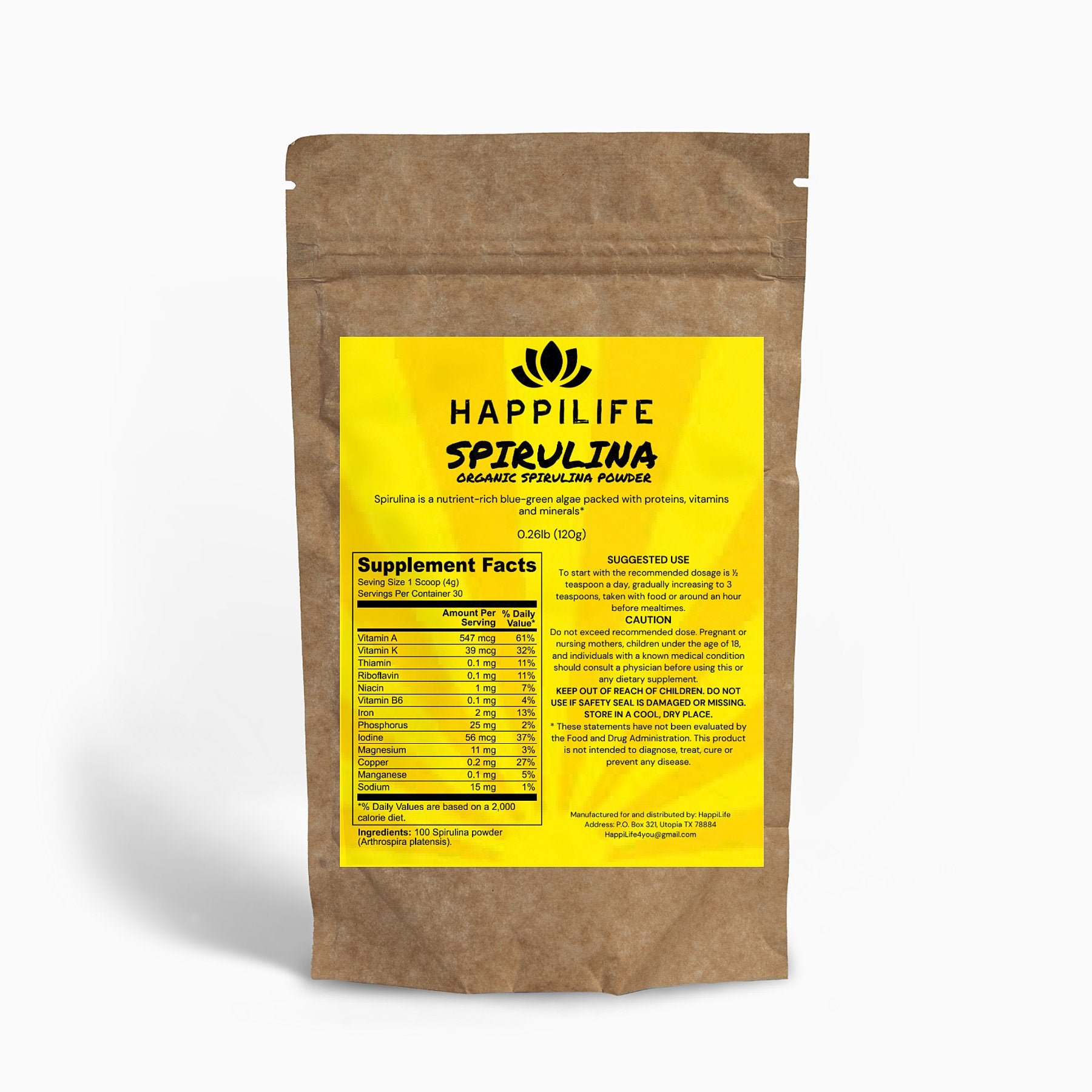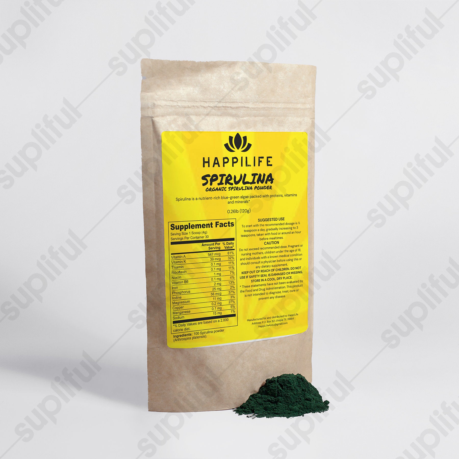 Ingredients: 100% Spirulina Powder (Arthrospira platensis).